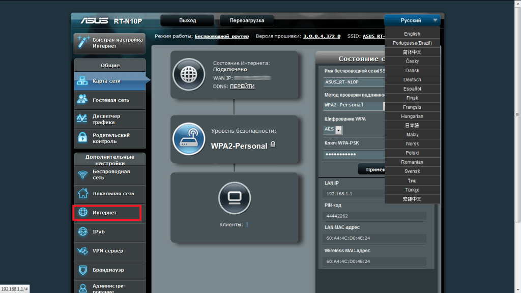 Настроив подключение к серверу провайдера, можно заняться настройкой WiFi ASUS rt n10p и параметрами безопасного доступа.