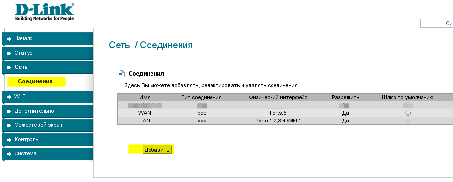 Снова нажмите в левой колонке меню вариант «Сеть» -> «Соединения» и нажмите кнопку «Добавить».