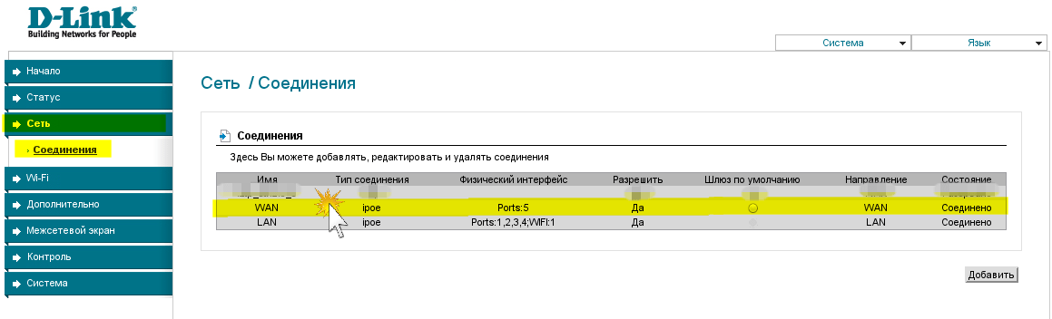 Кликните в левом столбце меню ссылку «Сеть», затем на странице кликните на строку со словом WAN.