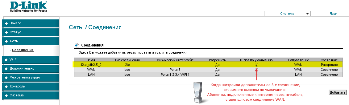 Затем нужно нажать кнопку добавить, выбрать тип соединения (PPTP или L2TP), в графе физический интерфейс выбрать WAN, в поле имя сервиса ввести адрес vpn сервера Вашего провайдера, далее в соответствующих графах указать имя пользователя и пароль, выданные Вашим провайдером для доступа к сети. Нажимаем сохранить. Сразу после этого мы вернемся к списку соединений. Для того, чтобы все заработало как следует нам необходимо указать только что созданное подключение как шлюз по умолчанию и снова сохранить настройки. Если все было проделано правильно, то напротив Вашего соединения будет написано, что подключение установлено и все, что Вам останется — это настроить параметры Вашей точки доступа WiFiРоутеры DIR-300 NRU N150 с последней на момент написания инструкции прошивкой rev. B6 настраиваются примерно также. После выбора ручной настройки необходимо войти во вкладку сеть и нажать добавить, после чего указать аналогичные вышеописанным пункты для Вашего подключения и сохранить настройки соединения. Например, для интернет-провайдера билайн эти настройки могут выглядеть следующим образом: