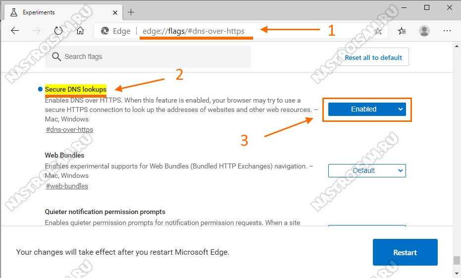 Параметру «Secure DNS lookups» ставим значение «Enable» и нажимаем на кнопку «Restart» внизу странички чтобы перезапустить браузер.