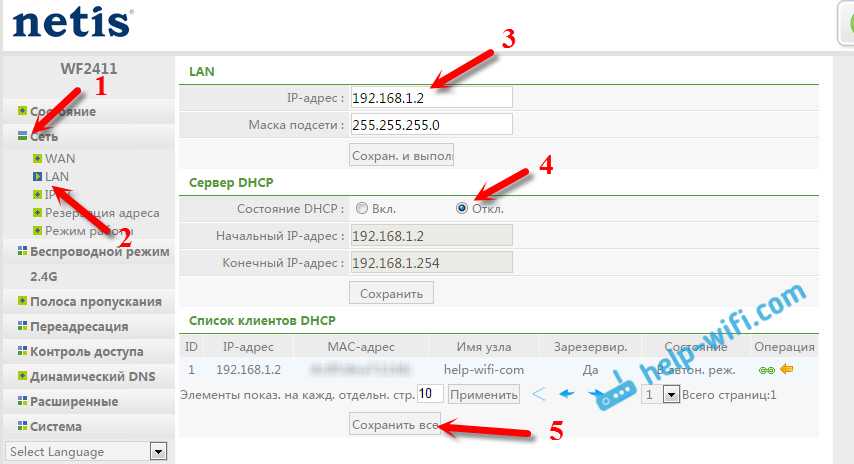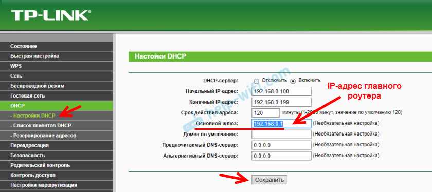 Откройте вкладку «Сеть» – «LAN». Меняем IP-адрес. Если у главного роутера, или модема 192.168.1.1, то пишем 192.168.1.2. Что бы отличалась только последняя цифра. Там же отключаем DHCP-сервер. И сохраняем настройки.