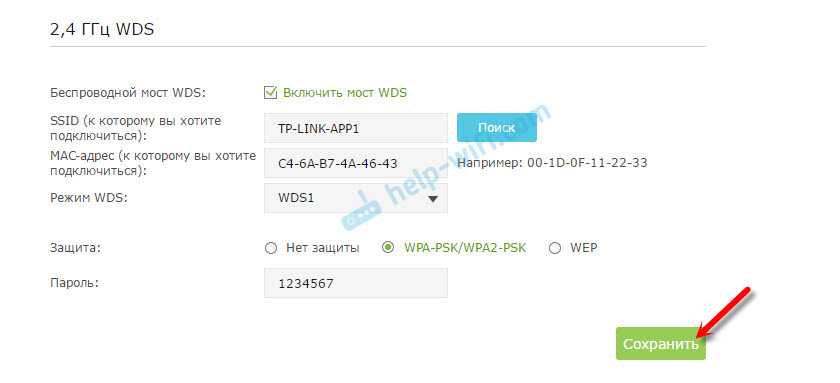 Установите галочку «Включить мост WDS» возле необходимой частоты. Я, например, поставил галочку возле 2,4 ГГц. Нажмите на кнопку «Поиск»
