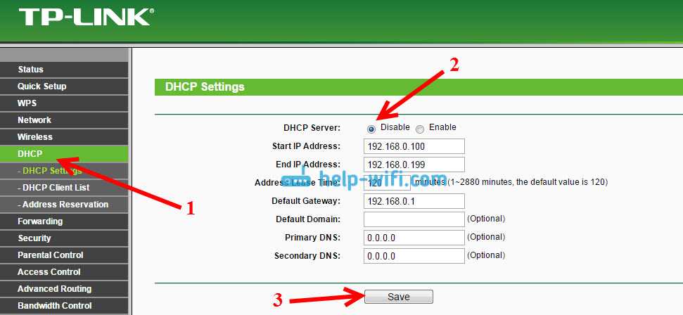 Я проверил все на TP-LINK TL-WR740N, и действительно, после отключения DHCP-сервера интернет сразу заработал по сетевому кабелю. Отключить DHCP совсем не сложно. В настройках маршрутизатора откройте вкладку DHCP, установите переключатель возле Disable (отключить), и сохраните настройки.