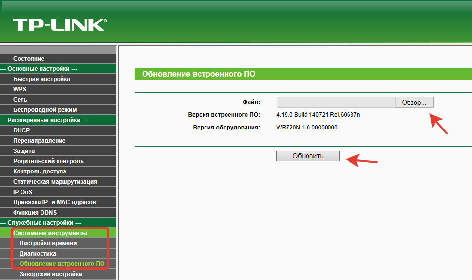 В разделе «Служебные настройки» в пункте «Системные инструменты» находим подпункт «Обновление встроенного ПО». В открывшемся окне через обзор указываем путь к файлу прошивки. После чего жмём «Обновить».