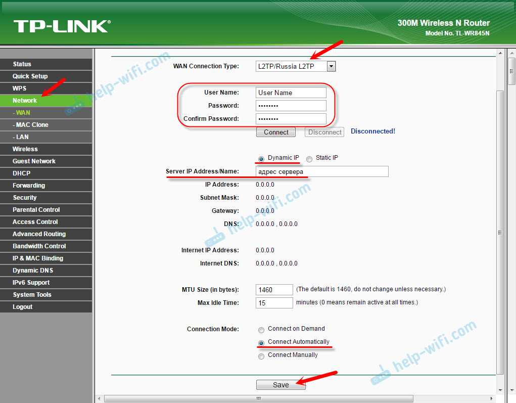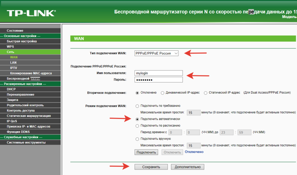 На данной странице вы увидите и другие параметры, но их изменять не нужно. Щелкните на кнопку “Сохранить”, а после — “Соединение”. Через мгновение, обновив страничку, вы должны увидеть, что режим сменился на “Подключено”. Таким образом, выполняется настройка всех моделей роутеров tp link, в том числе tl wr841n и tl w8151n.