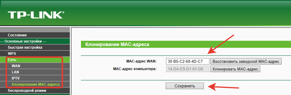 Если интернет уже работал на вашем компьютере при прямом подключении к сети, а после того, как подключили его через роутер, пропал, вероятно подключение привязано к МАС-адресу вашей сетевой карты. Чтобы восстановить его работу достаточно нажать кнопку «Клонировать МАС-адрес» и сохранить изменения.