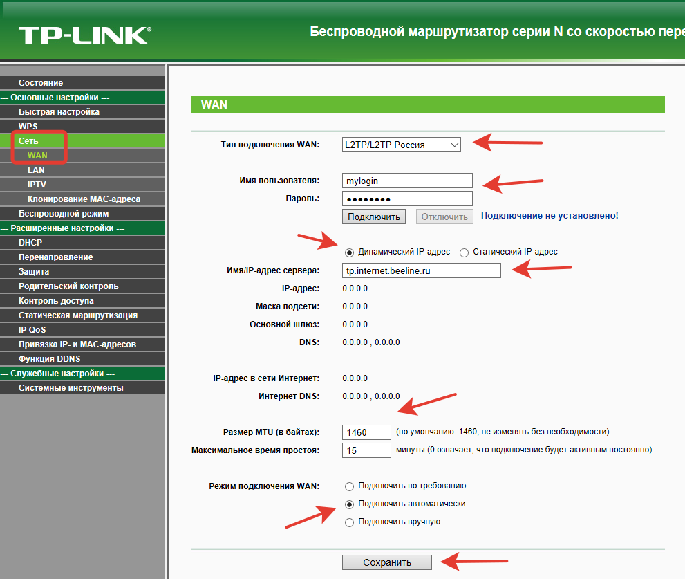 Пример настройки L2TP, или PPTP (например, провайдер Биллайн):