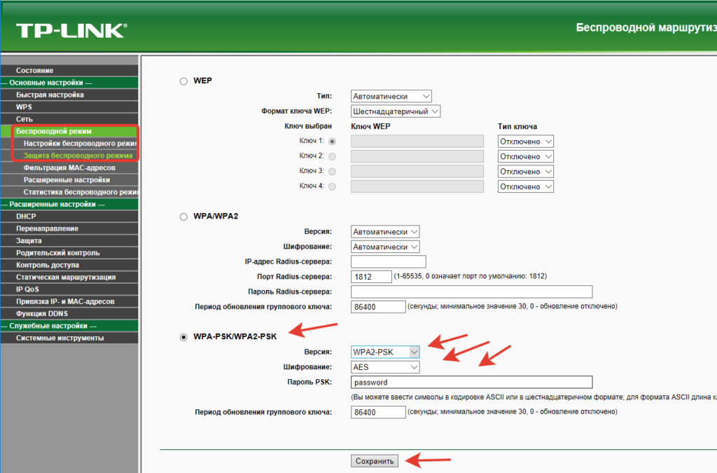 При настройке Wi-Fi на TL-WR720N, рекомендуется использовать пункт WPA2-PSK с шифрованием AES (как указано на рисунке выше) и в поле «Пароль PSK» указать свой пароль. После сохранения настроек для подключения через Wi-Fi указывать нужно будет его.