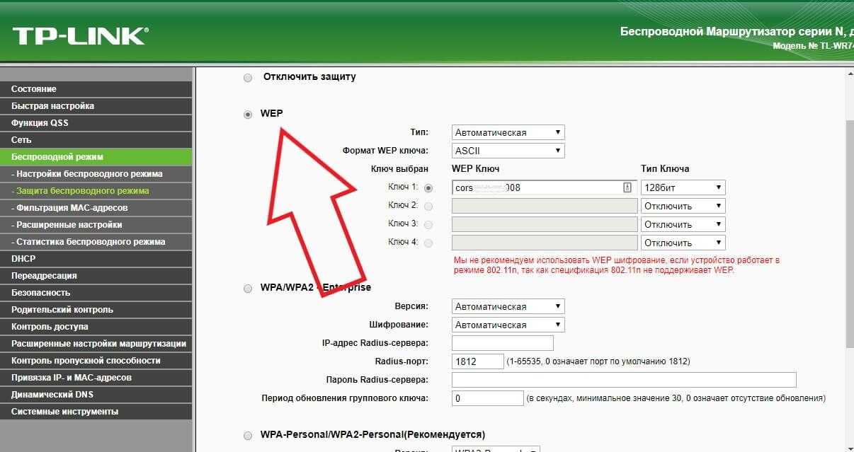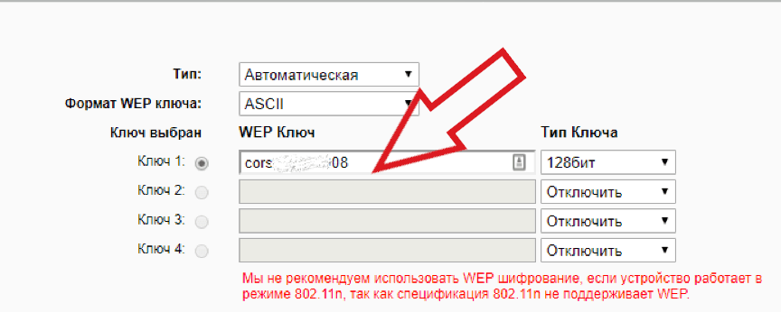 Следующий параметр – это пароль доступа. Рекомендуем проверить, правильное ли кодовое слово вы вводите при попытке соединения WiFi роутером на ноутбуке. Для просмотра и изменения пароля снова зайдите во вкладку «Беспроводной режим» — «Защита» и в поле «Ключ» проверьте кодовое слово (пароль подключения);