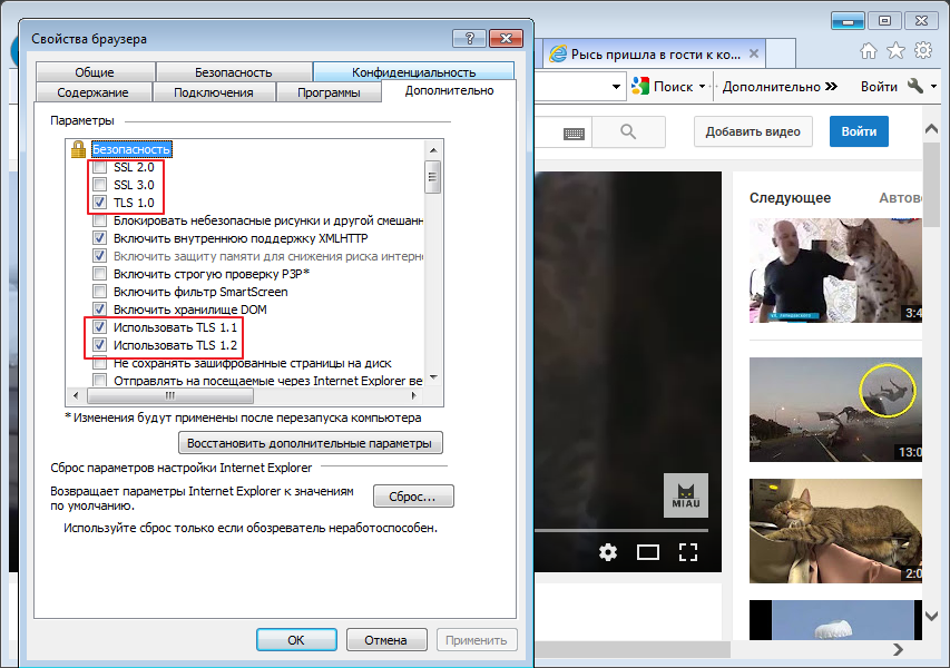 Заходим в «Сервис — Свойства браузера». Вкладка «Дополнительно». Проверяем наличие галочек в пунктах SSL 2.0, SSL 3.0, TLS 1.1, TLS 1.2, TLS 1.0. При отсутствии, отмечаем и перегружаем браузер.