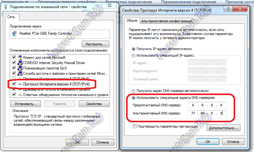 Здесь нужно будет поставить галочку «Использовать следующие адреса DNS-серверов» и прописываем туда адреса публичных DNS-серверов google (8.8.8.8 и 8.8.4.4) либо Яндекс (77.88.8.8). Нажимаем кнопку ОК и проверяем доступ в Интернет.