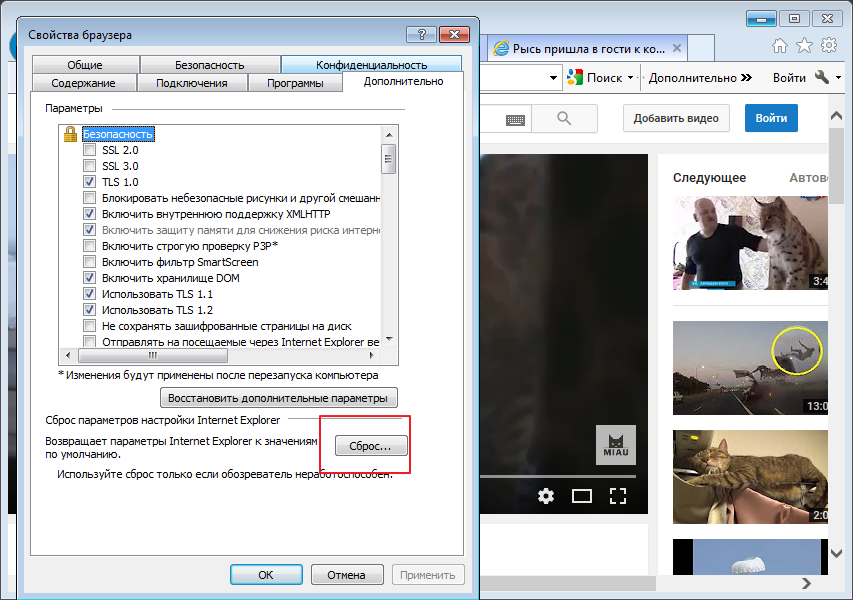 Если проблема не исчезла, опять заходим в «Панель Управления — Свойства обозревателя» и делаем «Сброс» всех настроек.