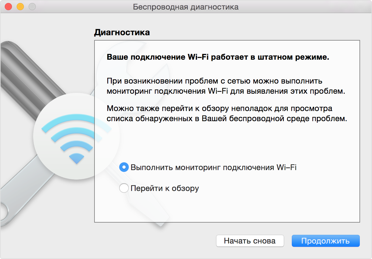 Перед выводом обзора программа «Беспроводная диагностика» автоматически сохранит диагностический отчет. Вы можете создать такой отчет в любое время: нажмите и удерживайте клавишу Option, затем выберите «Создать отчет диагностики» в меню состояния Wi-Fi . Процедура создания отчета может занять несколько минут.