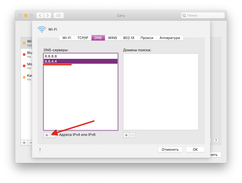 - Теперь выберите вкладку «DNS» и на панели «DNS-серверы» нажмите и введите следующие IP-адреса в разные строки: