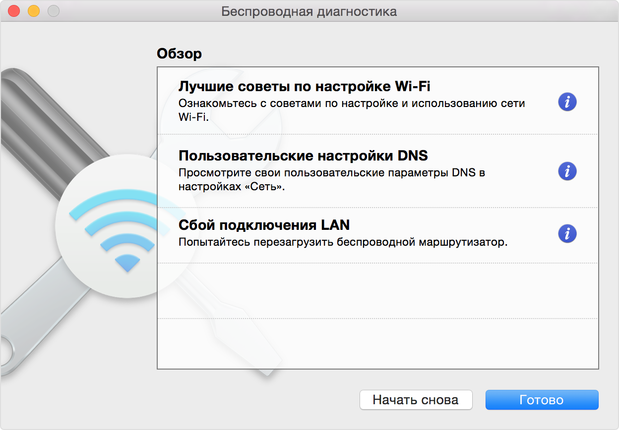 Для просмотра подробных сведений о каждом пункте в обзоре щелкните значок информации рядом с ним. «Лучшие советы по настройке Wi-Fi» — это рекомендации, которые будут полезны при работе с большинством сетей Wi-Fi.