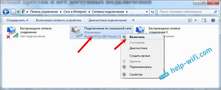 В новом окне вы должны увидеть адаптер «Подключение по локальной сети», или «Ethernet» (в Windiws 10). Это и есть сетевая карта. Если он в статусе «Отключено», то нажмите на него правой кнопкой мыши, и выберите «Включить».