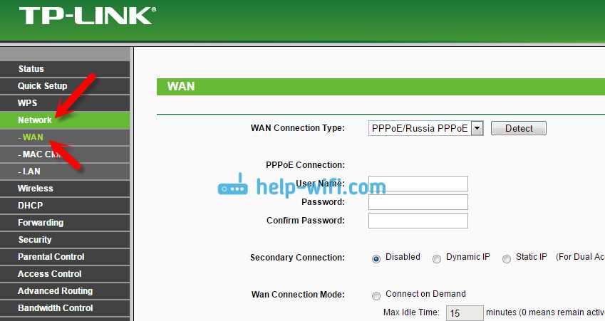 На Tp-Link параметры провайдера задаются на вкладке Network — WAN. Зайти в настройки можете по этой инструкции. В поле WAN Connection Type выберите нужный тип соединения, и задайте необходимые параметры (они зависят от выбранного соединения), которые предоставляет провайдер.