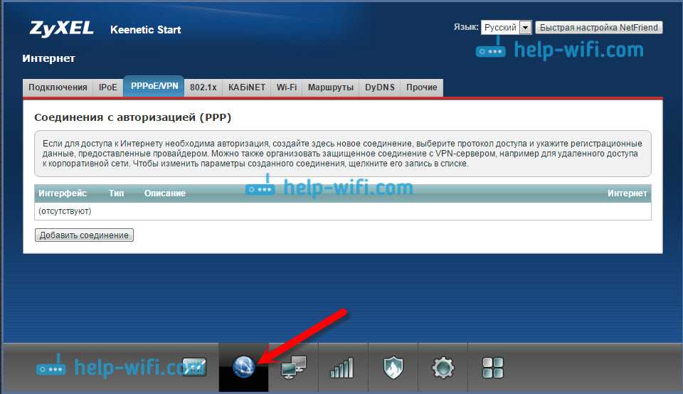 Если у вас ZyXEL не раздает интернет, то делаем так: заходим в настройки (подробная инструкция), переходим на вкладку Интернет, выбираем нужное соединение и добавляем его.