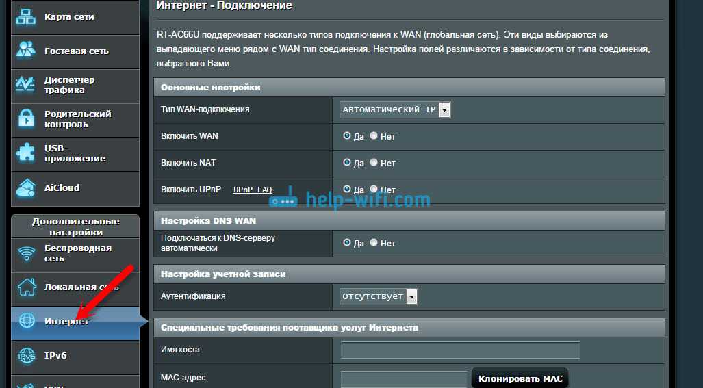 На устройствах Asus все примерно так же. Заходим в настройки, и переходим на вкладку Интернет. На этой странице и задаем параметры соединения с провайдером.