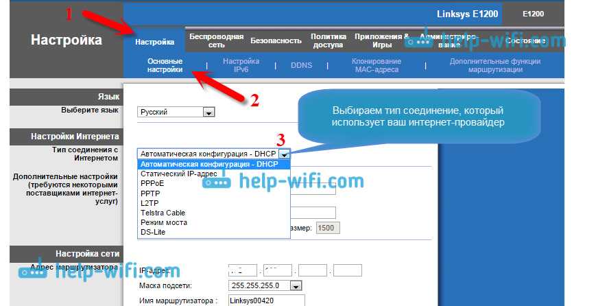 На Linksys нужно перейти на вкладку Настройка — Основные настройки. И там уже задать нужные параметры. Если не знаете как зайти в настройки роутера Linksys, то смотрите эту статью.