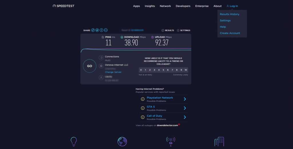 Это, пожалуй, самый популярный сервис для проверки скорости интернета в мире. В распоряжении Speedtest больше пяти тысяч серверов в разных странах. Вы можете выбрать один из них вручную или положиться на автоподбор. Сервис отображает исходящую и входящую скорости, а также пинг.