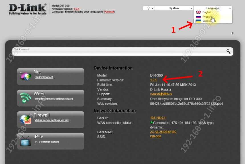 Ниже я покажу как обновить прошивку роутера Д-Линк двух версий. Первая — 1.0.4, которая шла на моём роутере с завода. Первое, что надо сделать, зайдя на страницу настройки, это изменить язык на русский, выбрав соответствующий пункт меню «Language» в правом верхнем углу.