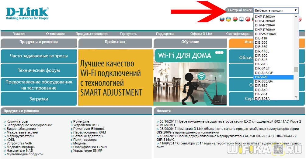 Если по каким-то причинам обновить роутер автоматически не удалось, например по причине недоступности удаленного сервера, то скачать прошивку D-Link DIR-300 можно самостоятельно с официального сайта dlink.ru. Там есть удобный быстрый поиск — из выпадающего списка выбираем свою модель.