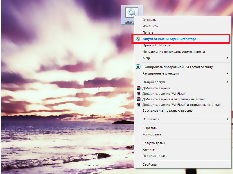 Сохраните его и закройте. При изменении имени поменяйте разрешение на bat. Как видно, этот файл автоматически запускает командную строку, создавая меню, которое реагирует на нажатия клавиш клавиатуры. Через меню осуществляется задание параметров, включение/отключение и выход из интерфейса. С помощью «батника» раздача Интернета с ноутбука выполняется удобно. Поместите его на рабочем столе для быстрого доступа. Можно даже прикрепить к нему запоминающуюся иконку.