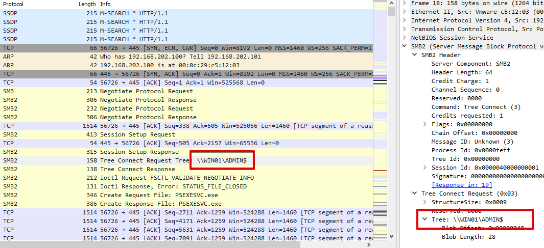 Копирование и запуск исполняемого файла происходят следующим образом. Вначале будет выполнено подключение к ресурсу ADMIN$ (C:\Windows), куда помещается файл. Затем необходимо соединиться с ресурсом IPC$ и обратиться с его помощью к интерфейсу SCM для создания и старта сервиса, который запустит скопированный файл. Всё это происходит поверх протокола SMB (Server Message Block).