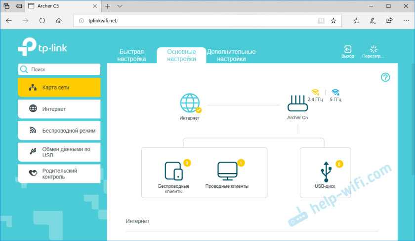 Необходимо, чтобы интернет заработал через наш TP-LINK Archer C20. Индикатор «Internet» должен гореть синим цветом.