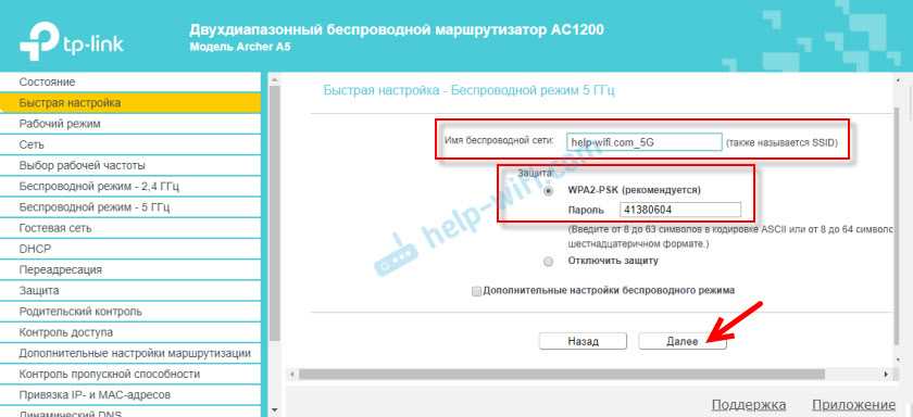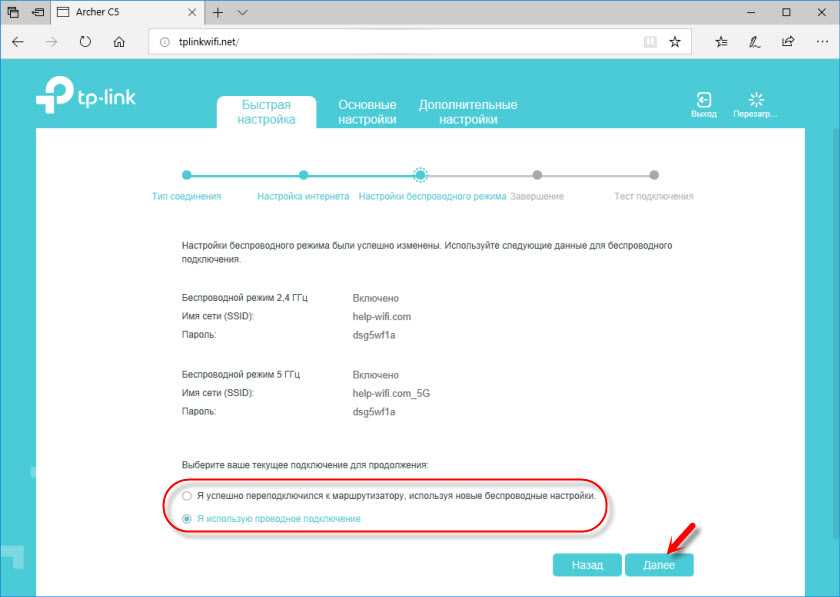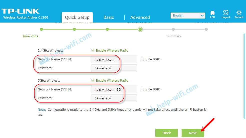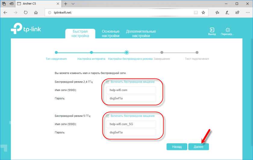 На следующем шаге можно настроить Wi-Fi сеть, которую будет раздавать TP-Link Archer C5 V4. Нужно сменить имя Wi-Fi сети и пароль. Для каждого диапазона. При необходимости, можно отключить сеть в определенном диапазоне. Достаточно убрать галочку возле «Включить беспроводное вещание». Если, например, вы пока не планируете подключать свои устройства к сети на частоте 5 ГГц. Или у вас нет устройств, которые поддерживают эту сеть. Потом можно будет включить ее в настройках.