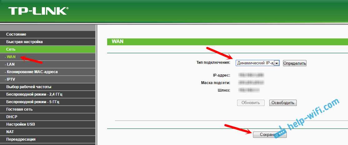 В настройках перейдите на вкладку «Сеть» – «WAN». Здесь, первым делом нужно выбрать тип подключения. У меня, например, Динамический IP. Если у вас такой же способ подключения, то выбирать ничего не нужно, он установлен по умолчанию. И интернет через роутер уже должен работать, а индикатор на роутере должен гореть синим, а не оранжевым. Единственный момент, если у вас «Динамический IP», то провайдер может делать привязку по MAC-адресу. Если роутер не подключаться к интернету, то уточните этот вопрос у провайдера.