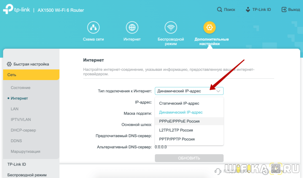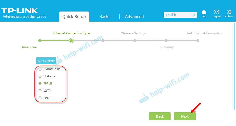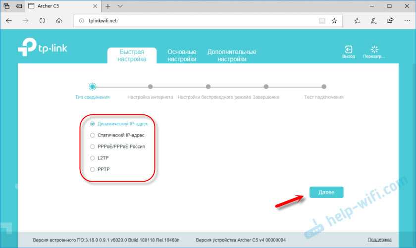 Выберите тип подключения к интернету, который использует ваш провайдер. Если не знаете какой – уточняйте у поддержки интернет-провайдера. Чаще всего это Динамический IP, или PPPoE. Так же часто используется L2TP и PPTP.
