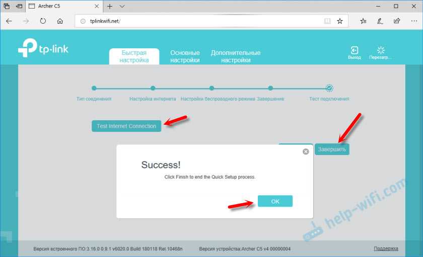 Можно сделать тест подключения к интернету. И если роутер подключен к интернету (результат «Success!» «Успех!»), то нажимаем на кнопку «Завершить». Если же подключения к интернету нет, то с помощью кнопки «Назад» вернитесь к выбору типа соединения и проверьте все параметры. Уточните настройки у провайдера.