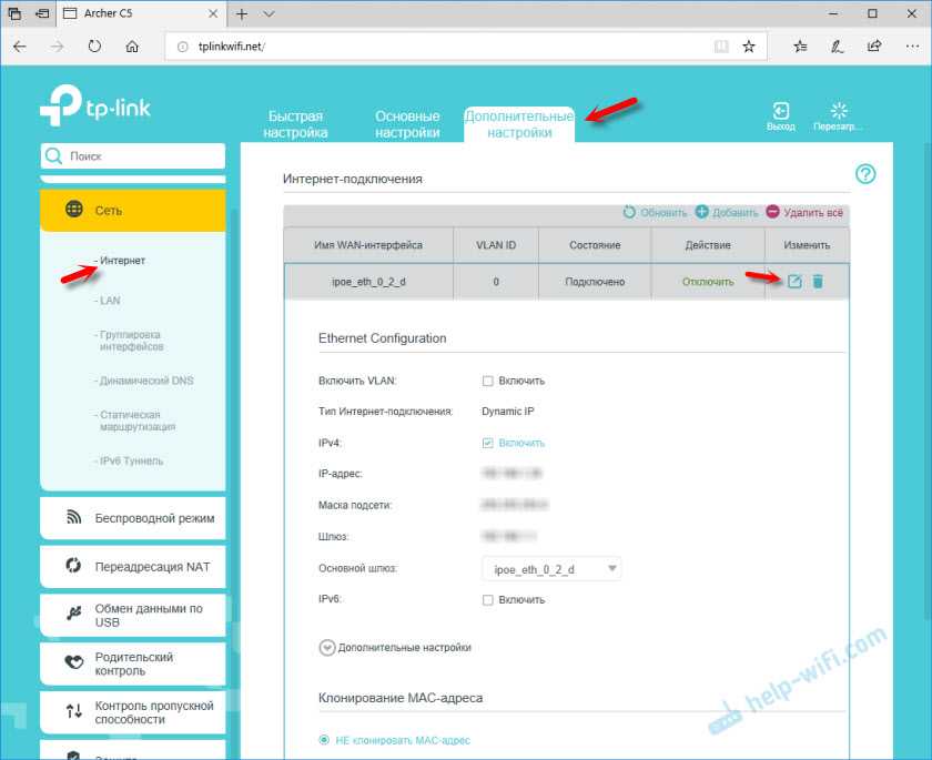 В разделе «Дополнительные настройки», на вкладке «Сеть» – «Интернет» можно сменить параметры подключения к интернету. Отредактировать или уделить уже созданное правило, или создать новое. Но если интернет через роутер работает, то лучше ничего не менять.