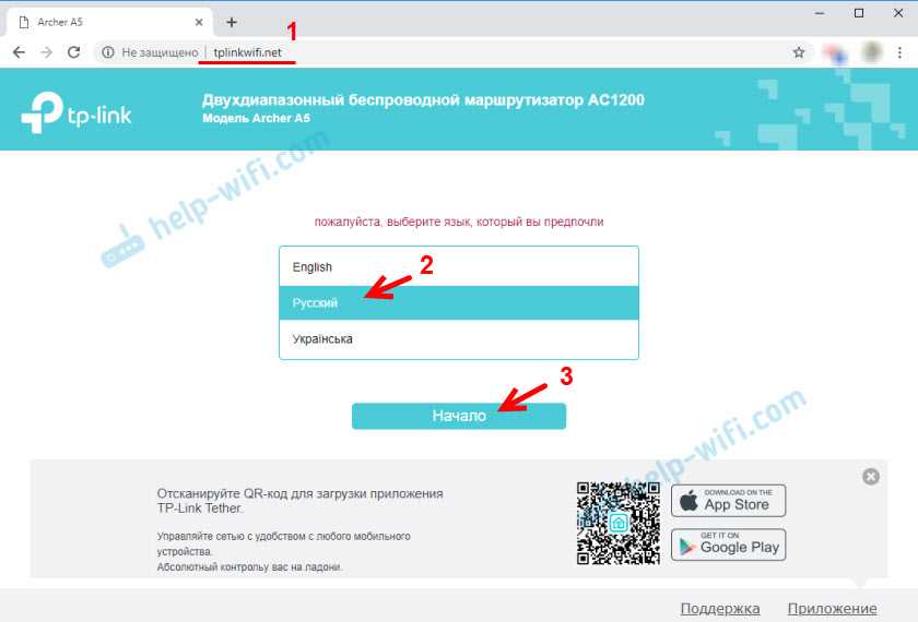 Открываем браузер (где нет VPN и других дополнений) и переходим по адресу http://tplinkwifi.net/. Можно так же использовать IP-адрес http://192.168.0.1. Если не получается зайти в настройки TP-Link Archer A5 – смотрите статью как зайти в настройки роутера TP-Link. Сначала выбираем язык веб-интерфейса маршрутизатора и нажимаем на кнопку «Начало».