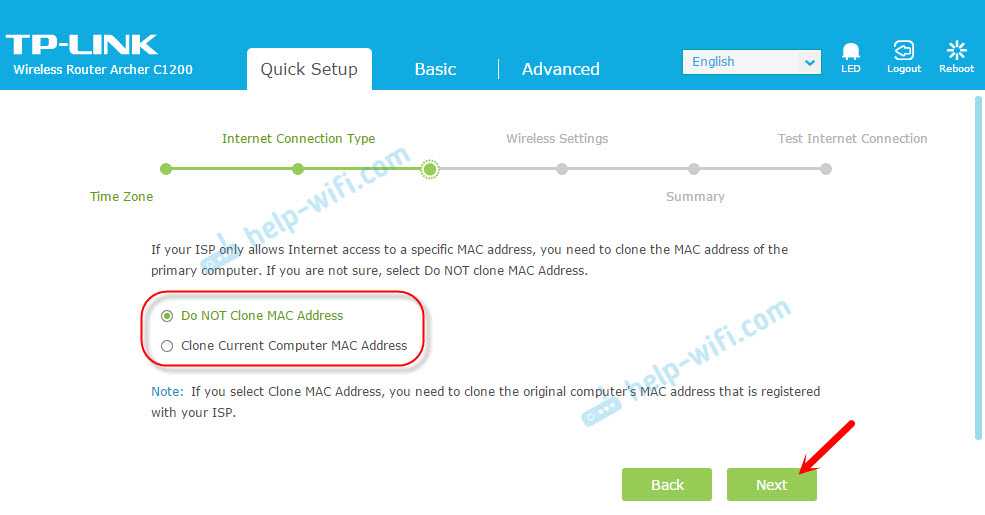 Это я показал для примера. У меня провайдер использует тип подключения «Динамический IP». Выбрав его, в следующем окне роутер спросит, есть ли привязка по MAC-адресу, и предложит клонировать MAC-адрес с компьютера, к которому сейчас подключен роутер. Мой провайдер не делает привязку по MAC-адресу.
