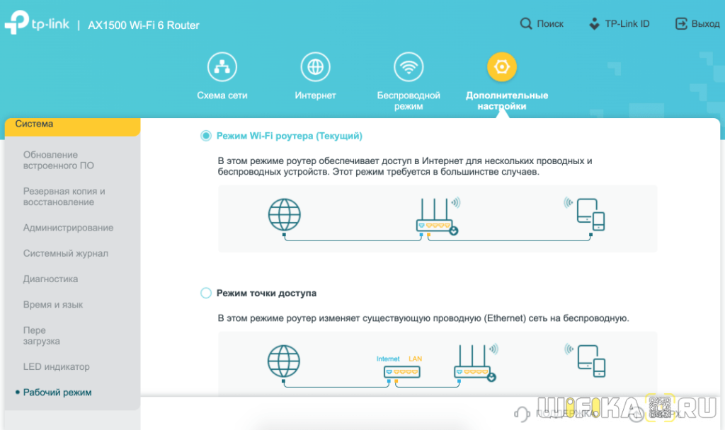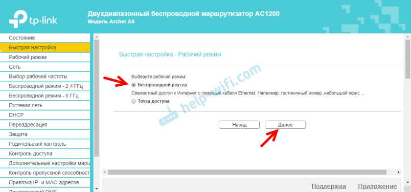 Выбираем рабочий режим «Беспроводной роутер». Почему-то на TP-Link Archer A5 не сделали еще один рабочий режим «Усилитель Wi-Fi сигнала», как это сделали не некоторых других моделях. Но в нашем случае он нам не нужен.