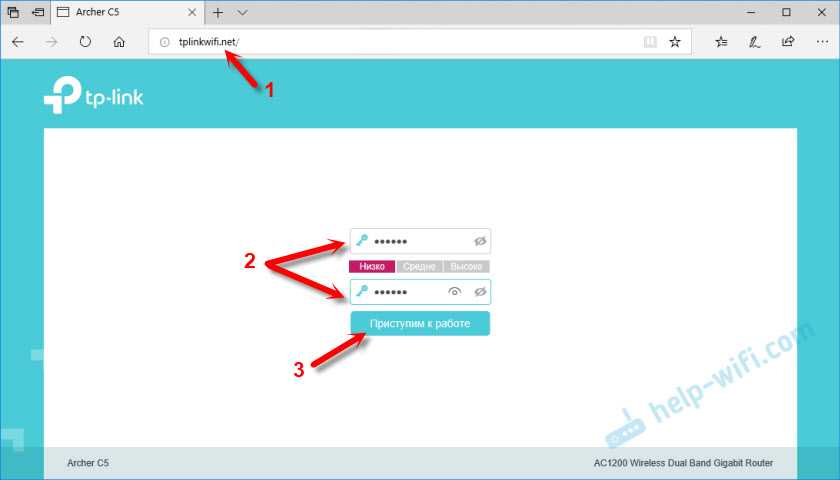 Если же он еще не настраивался, то появится окно, в котором нужно придумать и указать пароль. Этот пароль в дальнейшем будет использоваться для авторизации в настройках TP-Link Archer C5 V4. Постарайтесь его не забыть.