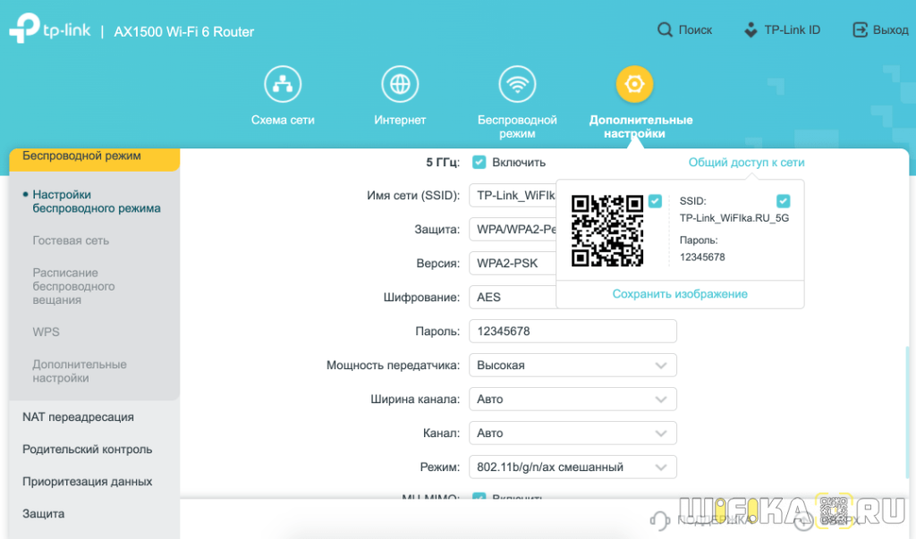 И расширенные настройки Wi-Fi сети (где можно сменить пароль, канал, режим работы, ширину канала и т. д.):