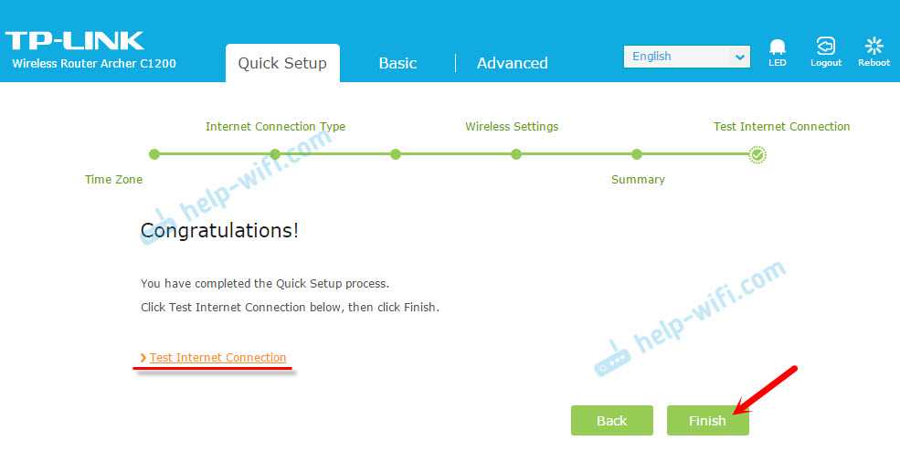 В следующем окне можно нажать на ссылку «Test Internet Connection». Если все хорошо, роутер подключился к интернету, то нажимаем на кнопку «Finish».