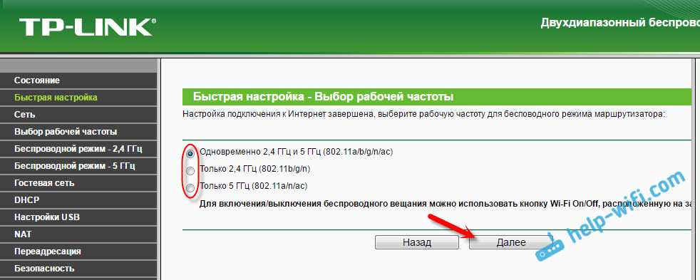 Если все правильно, то появится окно с настройкой Wi-Fi сети. Точнее, окно, в котором нужно выбрать, на какой частоте вы хотите использовать Wi-Fi сеть. Можно выбрать только 2,4 ГГц, или 5 ГГц. Или же использовать одновременно оба диапазона. Выберите нужный пункт, и нажмите «Далее». Я выбрал «Одновременно 2,4 ГГц и 5 ГГц (802.11a/b/g/n/ac)». Это значит, что роутер будет транслировать две Wi-Fi сети на разных частотах.