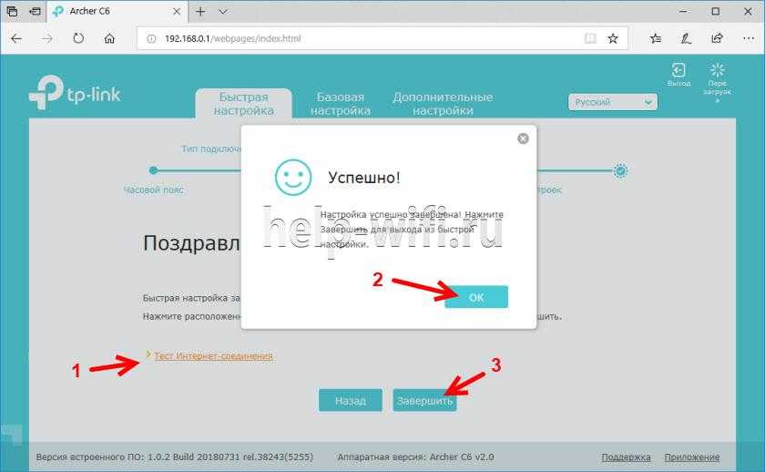 9. Протестируйте настройки, кликнув по надписи «Тест интернет-соединения». Должно появится окошко «Успешно». В нем нажмите «Ок», а затем «Завершить».