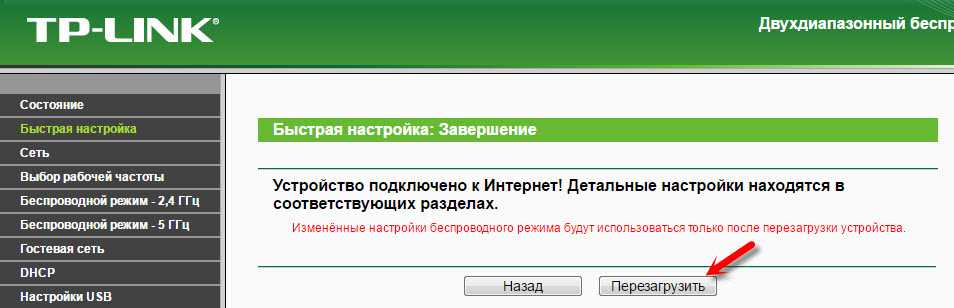 Видим окно с сообщением, что настройка завершена, и интернет работает. Нажимаем на кнопку «Перезагрузить».