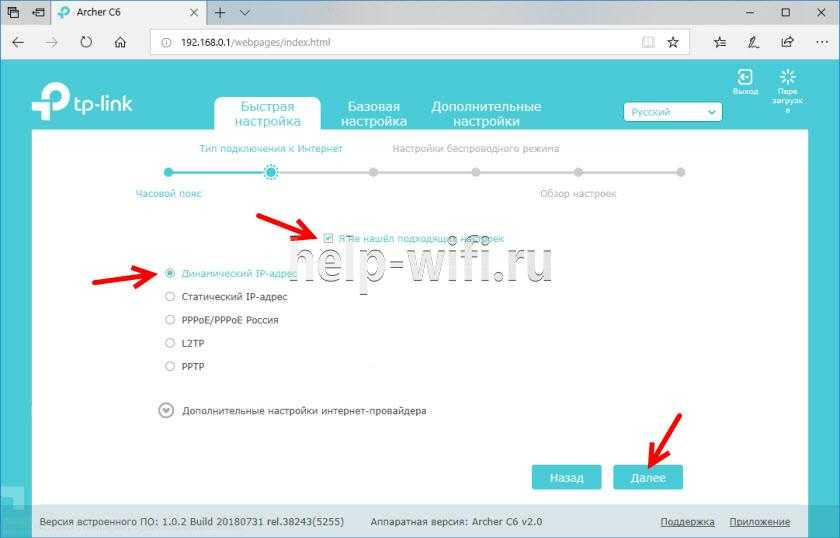 Нужно выделить тот тип подключения, который использует ваш интернет-провайдер (Динамический IP-адрес, Статический IP-адрес, PPPoE, L2TP, PPTP)