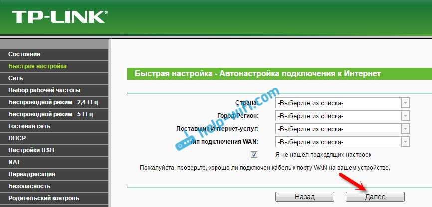 . Если вы не найдете своего провайдера, то поставьте галочку возле пункта «Я не нашел подходящих настроек». И нажмите «Далее».