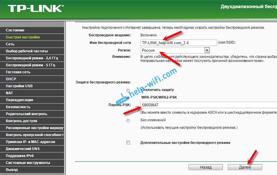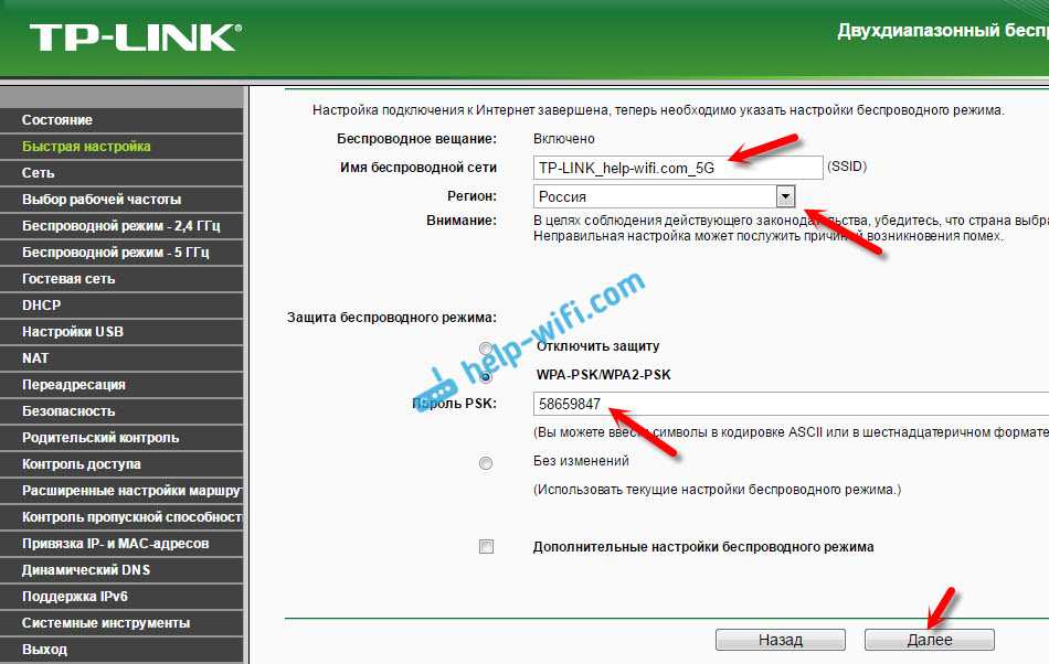 Дальше появится окно, в котором нужно задать имя для Wi-Fi сети, выбрать свой регион, и указать пароль, который будет использоваться для подключения к Wi-Fi. Если вы выбрали «2,4 ГГц и 5 ГГц», то появится два окна, для каждой частоты отдельно.