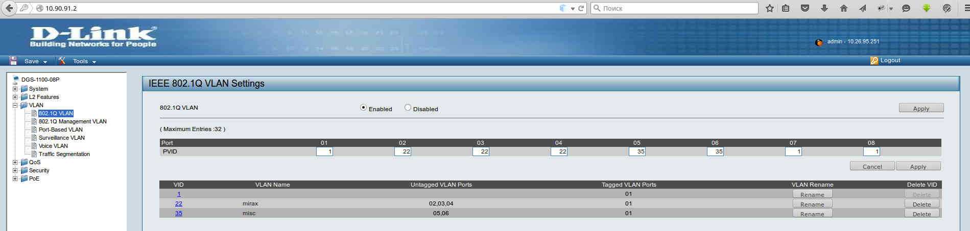 Настройка DGS-1100-08P. Подключимся к нему в первый порт. Присвоим ему IP 10.90.91.2. Создадим 3 VLAN: vlan1 (порт 1 (tagged)) для служебного использования, то есть только для настройки коммутатора, vlan22(порт 1 (tagged); порты 2,3,4 (untagged)), vlan35(порт 1 (tagged); порты 5,6 (untagged)). Порты 7,8 не используются и выключены через меню Port Settings(Speed: Disabled).
