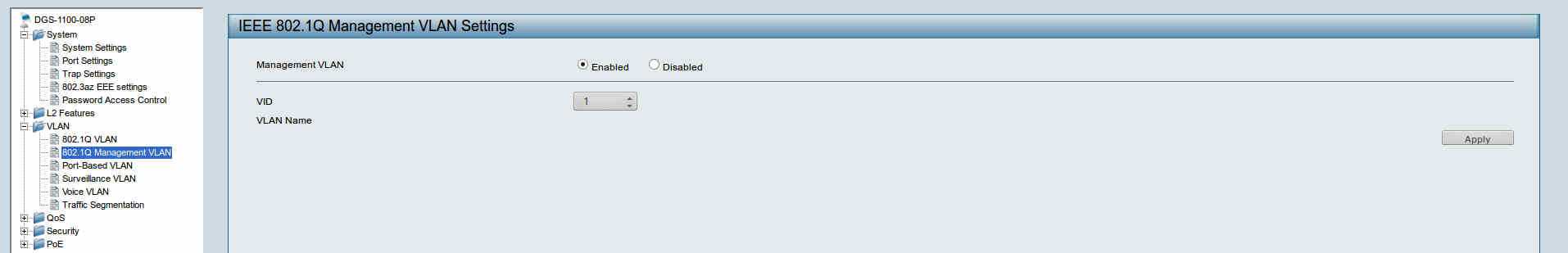 Укажем, что в дальнейшем управлять D-Link DGS-1100-08P (IP 10.90.91.2) можно управлять только через vlan1, то есть в нашем случае системный администратор должен подключиться в первый порт DGS-1100-08P(При подключении в иной порт — коммутатор не разрешит доступ к 10.90.91.2).